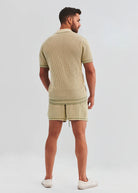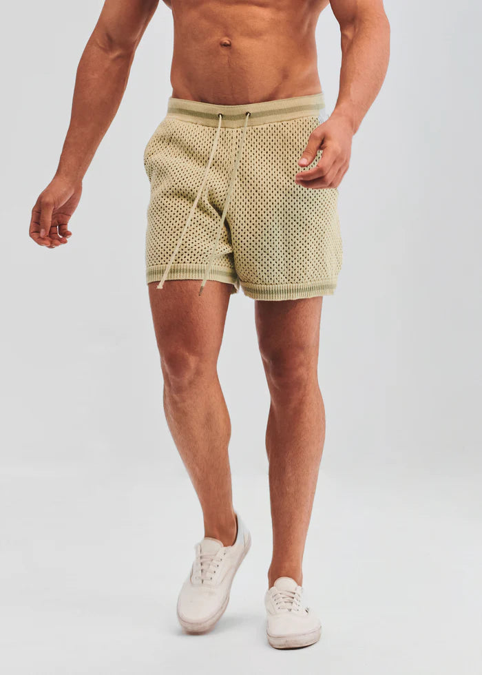 Crochet lounge short featuring contrasting color at the waist and cuff. Drawstring at waist. Shown here in White/Blue.