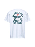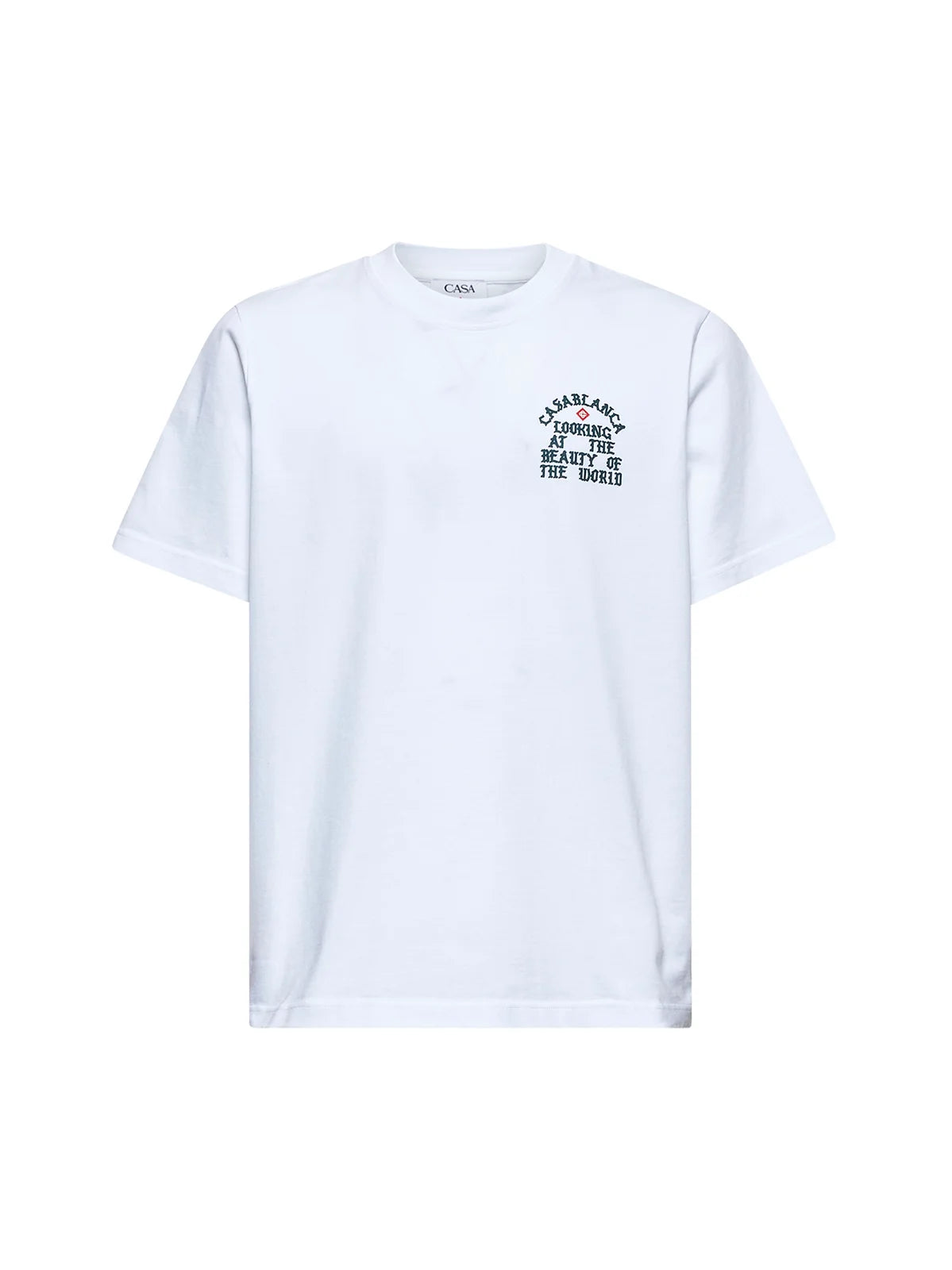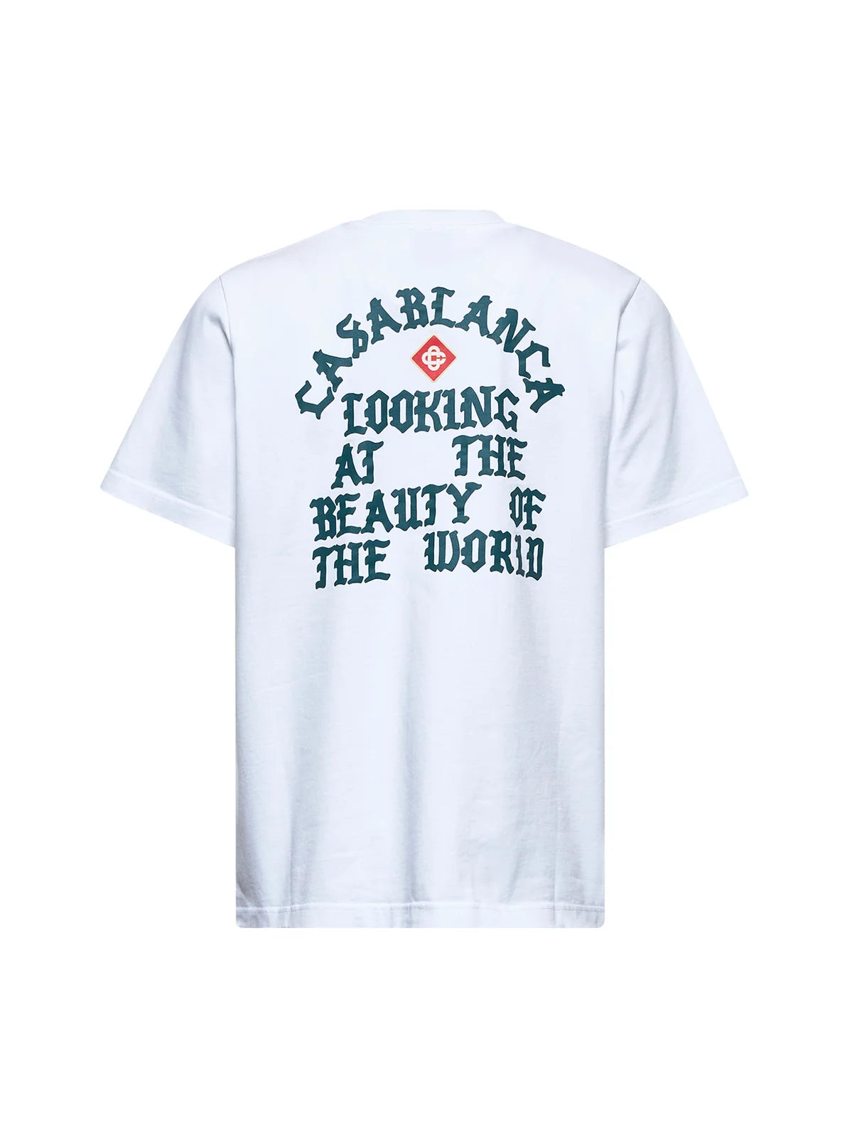 A short-sleeve pullover with a neutral-hued backdrop and striking deep-toned graphic lettering, this T-shirt delivers a clean silhouette and comfortable fit. The organic cotton composition and understated aesthetic lend themselves perfectly to relaxed, casual settings.