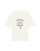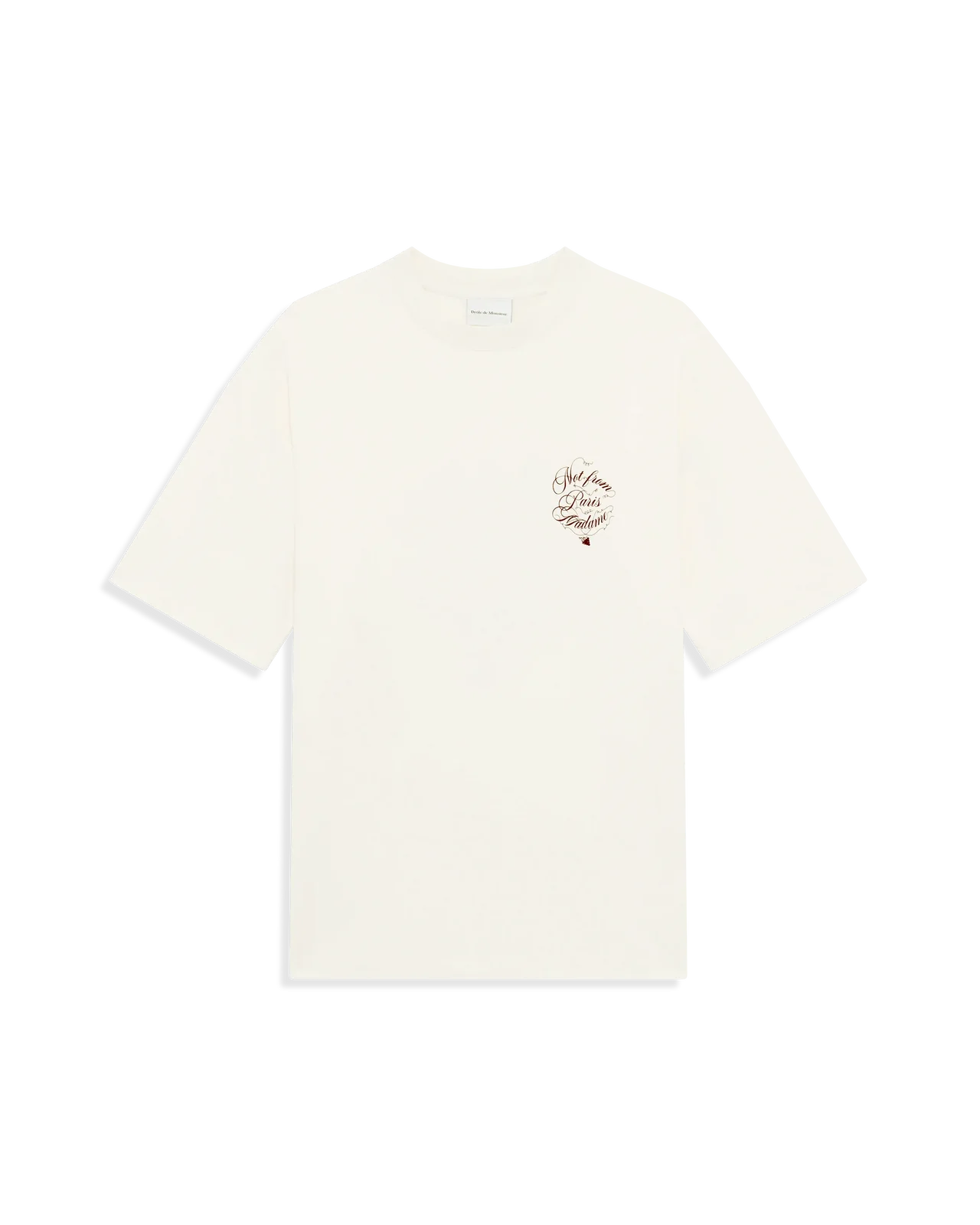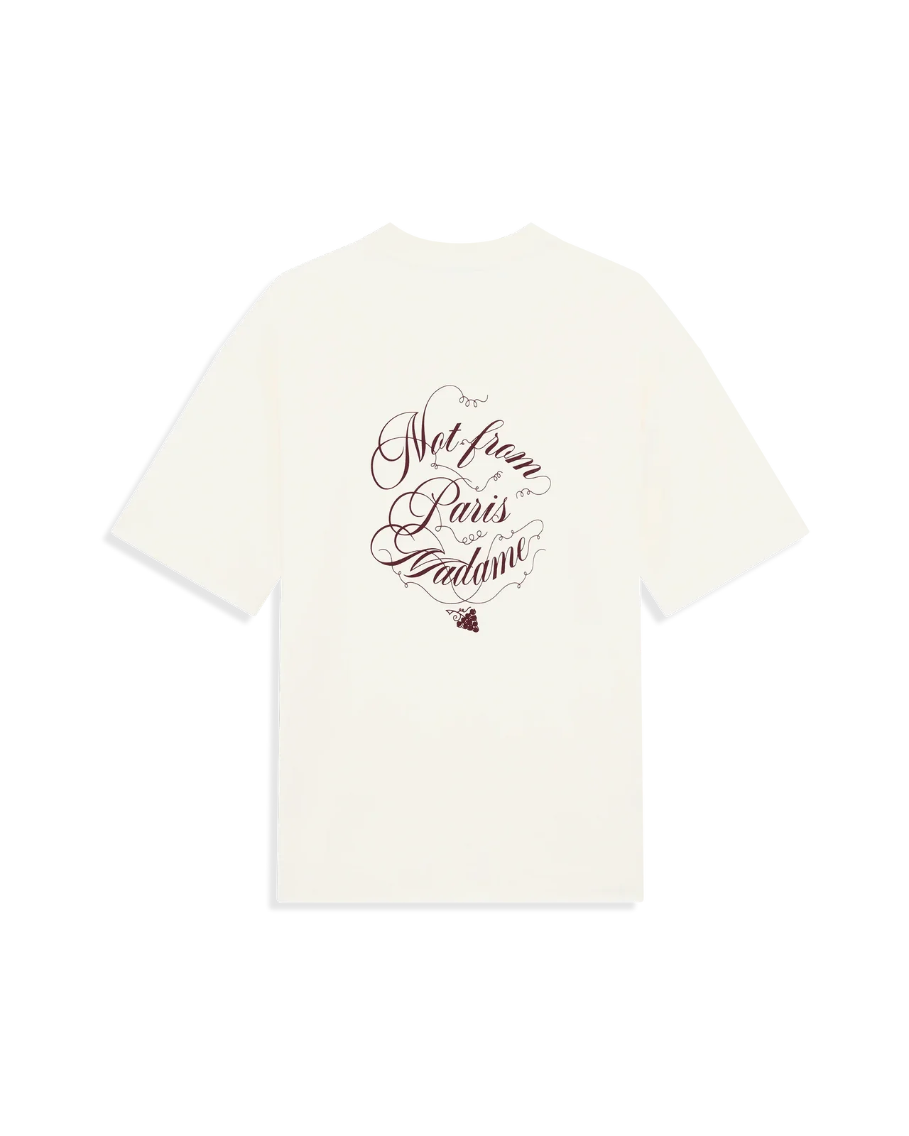 cream 100% cotton interlock t-shirt with a ribbed neckline features the Slogan Vignes print on the front and back.