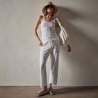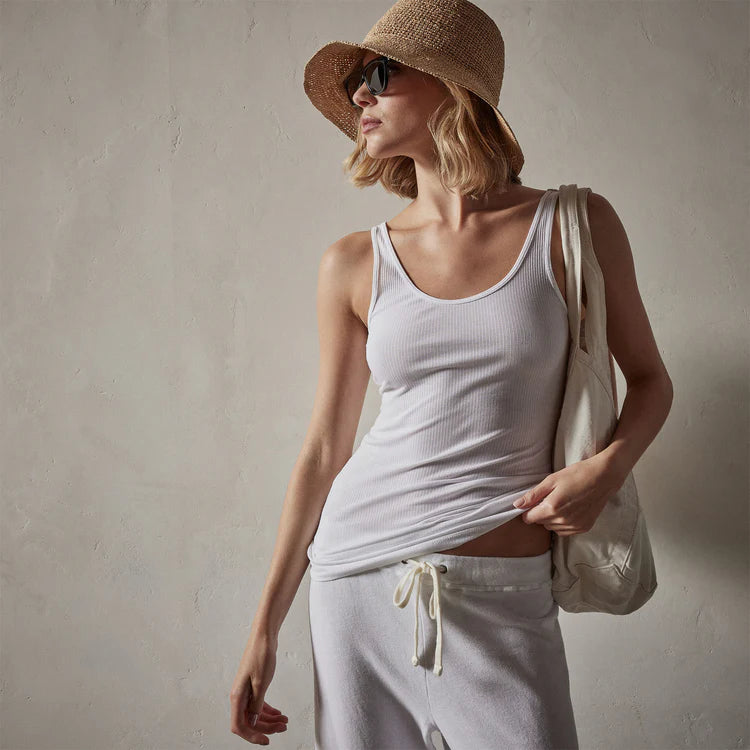 Ribbed Daily Tank is made in a cotton lycra blend characterized by an all over rib and has a soft, matte-like finish. Style details include a bound scoop neckline and armholes and a coverstitched bottom hem. Fitted to the body. Garment dyed with extra softeners for a soft, lived in feel.